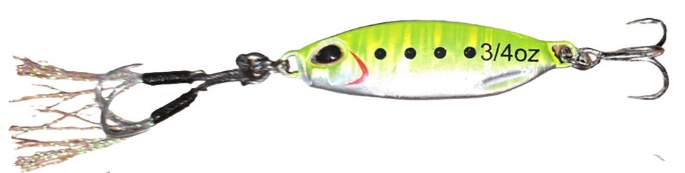 The Vertical Jig is one of the most effective jigs for year-round fishing. This jig was designed to attract fish in the dark using two stinger hooks with translucent fiber. The treble hook selected for this lure is a 4X hardness to take on the largest fish in the water.