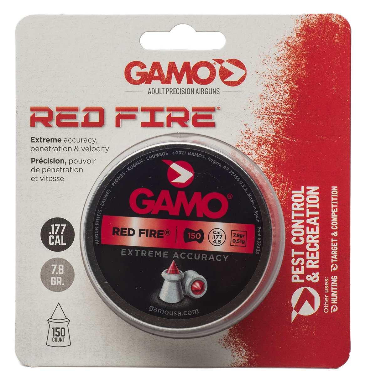 Experience match-grade accuracy, high-velocity performance and hydraulic expansion at point of impact with Gamo?s Red Fire. The diamond shaped hard polymer tip provides a true ballistic trajectory. The force of impact drives the diamond polymer tip into the cylindrical jacket material forcing it to expand outward?increasing the diameter of the projectile as it passes through the intended target (mushrooming effect on impact).