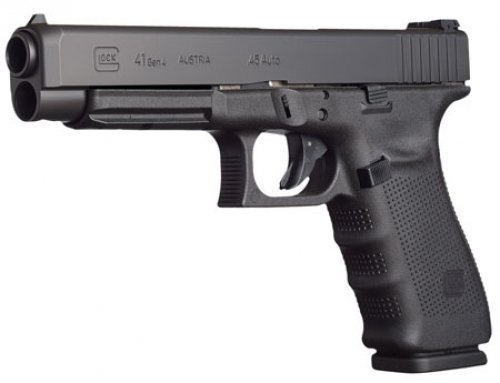 The GLOCK G41 G4 is a full-size pistol chambered in .45ACP. It features a 5.31-inch barrel and a 13+1 capacity. The G41 G4 is designed for competition and law enforcement use, with a polymer frame and a safe action trigger system. It is also equipped with adjustable rear sights and a reversible magazine catch.