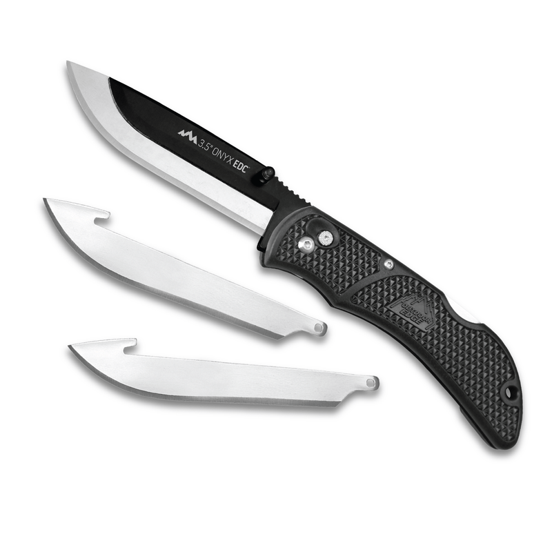The Onyx 3.5" Replaceable Blade Knife by Outdoor Edge, a versatile and indispensable tool for every outdoor enthusiast. This compact and rugged knife is designed to handle a wide range of tasks, from field dressing game to everyday cutting needs. With its innovative replaceable blade system, the Onyx ensures you're always working with a razor-sharp edge. The Onyx comes with three blades in total and is compatible with 350 blades.